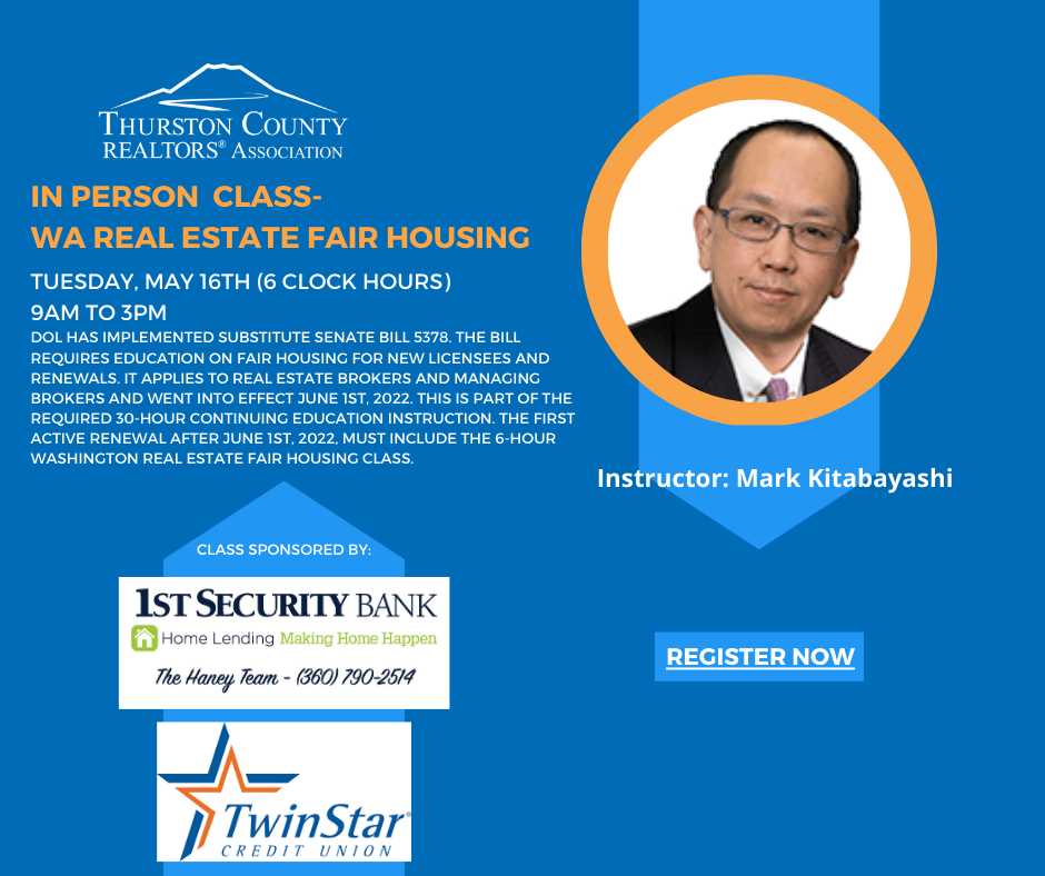 REGISTER NOW FOR DOL REQUIRED FAIR HOUSING CLASS! Fair Housing for new licensees and renewals. It applies to real estate brokers and managing brokers and went into effect June 1st, 2022. This is part of the required 30-hour continuing education instruction. The first active renewal after June 1st, 2022, must include the 6-hour Washington Real Estate Fair housing class. With every renewal afterward, licensees must complete a 3-hour course.